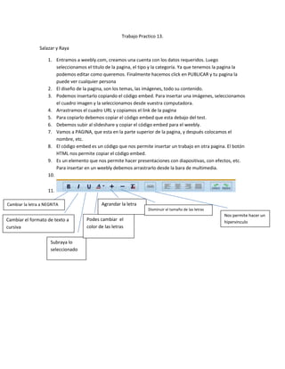 Este documento proporciona instrucciones para crear una página web en Weebly. Explica cómo crear una cuenta, seleccionar un título y categoría para la página, y editar el diseño e insertar contenido como imágenes y enlaces. También describe cómo copiar código embed para insertar presentaciones de SlideShare u otros elementos multimedia en la página de Weebly.