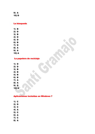 Este documento contiene las respuestas a varias preguntas sobre diferentes temas relacionados con el sistema operativo Windows 7, incluyendo el escritorio, el explorador, la búsqueda, aplicaciones incluidas y configuración de hardware y software.
