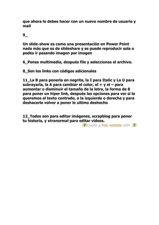 Este documento proporciona instrucciones para crear un sitio web en jimdo.com, diseñar la página principal, agregar contenido como multimedia, editar texto e imágenes, y compartir contenido a través de enlaces o presentaciones de diapositivas. Explica cómo crear una cuenta, personalizar la página, agregar elementos arrastrándolos desde la barra de herramientas, y usar códigos para formato y estilo de texto.