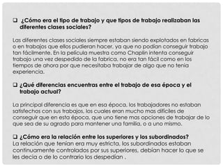 El documento resume la película Tiempos modernos de Charlie Chaplin, que muestra las difíciles condiciones laborales de la época. Los trabajadores tenían poca autonomía y estaban sujetos al estricto control de sus superiores. Realizaban trabajos repetitivos en las fábricas sin descansos adecuados y con bajos salarios. Esto contrasta con las condiciones laborales actuales, donde los trabajadores tienen más derechos y protecciones.
