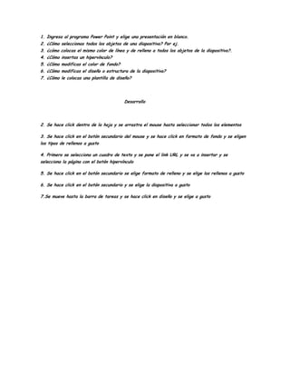 Este documento proporciona instrucciones sobre cómo realizar diferentes tareas en PowerPoint, incluyendo cómo seleccionar objetos en una diapositiva, agregar hipervínculos e imágenes, modificar el color de fondo y diseño de la diapositiva, y aplicar una plantilla de diseño.
