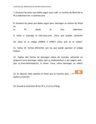 Este documento contiene instrucciones para el uso de blogs y sitios web para compartir contenidos. Explica cómo insertar videos, imágenes, enlaces y archivos desde plataformas como YouTube, SlideShare y cómo modificar plantillas de blog. También define términos como gadget y código HTML y ofrece formas de descargar videos desde páginas web.