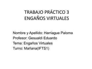 Este documento define los engaños virtuales y describe varios tipos comunes como phishing, mensajes en cadena, pop-ups y robo de identidad. Explica cómo los estafadores buscan información personal y cómo reconocer y evitar los engaños virtuales manteniendo la seguridad de los datos y la privacidad en línea.