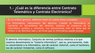 Este documento discute las diferencias entre contratos telemáticos, electrónicos e informáticos. Explica que un contrato telemático no necesariamente es electrónico, sino que se refiere al software utilizado para realizar contratos electrónicos. Un contrato electrónico implica la voluntad de realizar un acto jurídico a través de medios electrónicos, como hacer clic para comprar algo en línea. Los contratos de adhesión carecen de libertad contractual y son pre-redactados unilateralmente para un destinatario indeterminado.
