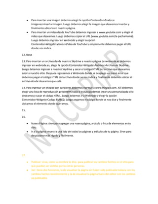 El documento proporciona instrucciones para crear y editar un sitio web en Webnode. Explica cómo registrarse, elegir un URL, agregar páginas, elementos y publicar el sitio. También describe cómo modificar la imagen de cabecera, agregar enlaces, archivos, tablas, imágenes y videos. Finalmente, detalla cómo insertar contenido desde Skydrive y Mixpod.