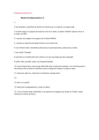 Este documento proporciona instrucciones sobre cómo personalizar una página web utilizando las herramientas de edición disponibles. Explica cómo modificar la página de inicio, insertar imágenes, vínculos, videos y contenido desde otras páginas web. También describe cómo cambiar el título del sitio, agregar elementos complementarios, cargar álbumes de fotos y eliminar páginas existentes.