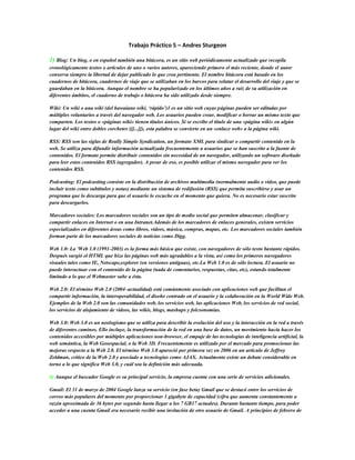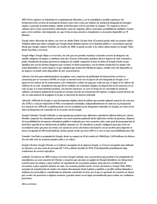 El documento describe varios servicios de Google como Gmail, Google Maps, Google Video, AdSense, AdWords, Google Calendar, YouTube y Google Chrome. También menciona otros servicios menores como Google News, Google Reader, Google Analytics y Google Docs. Explica brevemente las funciones y características clave de cada uno de los principales servicios de Google.