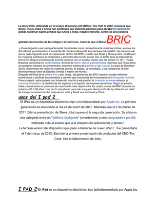 El documento describe la tesis BRIC, la cual argumenta que Brasil, Rusia, India y China han adoptado el capitalismo global y se convertirán en los principales proveedores mundiales de tecnología, servicios, y materias primas. También predice que el BRIC podría formar un gran bloque económico con estatus mayor que el G8. Explica cómo estos países han realizado reformas para integrarse a la economía mundial y han fortalecido la educación y la inversión para competir.