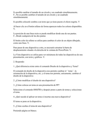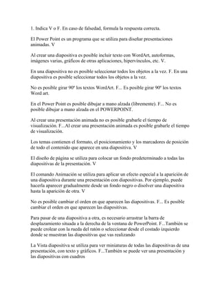 Este documento contiene 21 preguntas sobre las funciones y herramientas de PowerPoint. Proporciona respuestas verdaderas o falsas a afirmaciones sobre PowerPoint y pide que se corrijan las respuestas falsas. También incluye preguntas sobre cómo realizar diferentes tareas en PowerPoint como aplicar animaciones, cambiar el orden de diapositivas, agregar fondos y más.