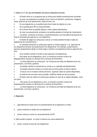 Este documento contiene preguntas sobre las funciones y herramientas de PowerPoint. Hace 21 preguntas sobre cómo realizar diferentes tareas como modificar el diseño y orden de las diapositivas, aplicar temas y transiciones, agregar animaciones a objetos, e insertar y modificar fondos. También incluye una sección de verdadero o falso sobre declaraciones relacionadas con el uso de PowerPoint.