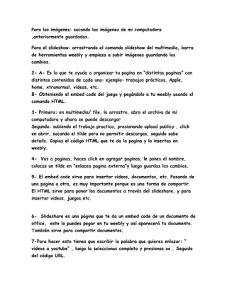 Este documento proporciona instrucciones para insertar diferentes tipos de medios como videos, imágenes y documentos en una página Weebly. Explica cómo agregar estos elementos arrastrándolos o usando códigos HTML y URLs. También cubre cómo crear enlaces internos y externos, y la diferencia entre direcciones URL y códigos HTML.