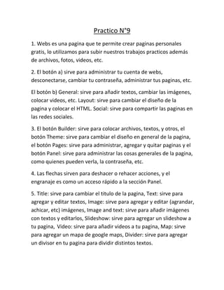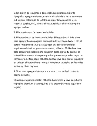Este documento describe las funciones de la plataforma Webs para crear páginas web gratuitas. Explica que Webs permite subir trabajos, archivos, fotos y videos. Describe los botones para administrar cuentas y páginas, agregar contenido como texto, imágenes y videos, y compartir páginas en redes sociales. También explica cómo cambiar el diseño y formato de texto en las páginas de Webs.