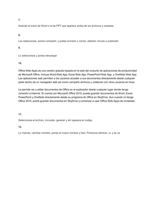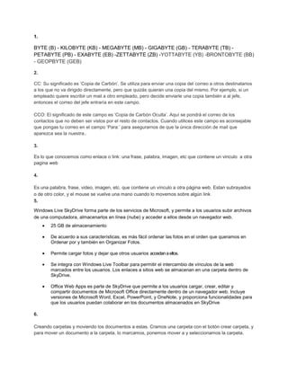 Este documento define unidades de medida de almacenamiento digital como bytes, kilobytes, megabytes, etc. Luego explica conceptos relacionados con correo electrónico como CC y CCO. También describe características del servicio de almacenamiento en la nube Microsoft SkyDrive como su capacidad de 25GB, edición de documentos de Office en línea y compartir archivos.