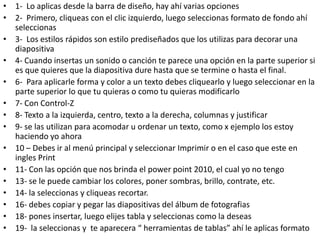 Este documento proporciona instrucciones sobre cómo usar diferentes funciones de PowerPoint como aplicar formatos de texto y fondo, insertar tablas, sonidos e imágenes, imprimir presentaciones, y guardar archivos en formatos como PDF. Explica cómo realizar acciones como cortar, copiar y pegar diapositivas, capturar pantallas, y compartir presentaciones con otros para que puedan ver el contenido.