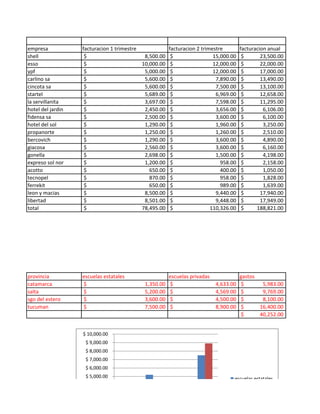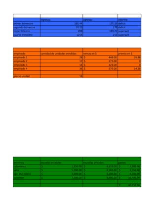 El documento presenta información financiera trimestral de ingresos y egresos, ventas y premios de diferentes empleados, gastos educativos por provincia, facturación trimestral y anual de empresas, y detalles impositivos. Resume datos estadísticos y financieros de múltiples categorías en una serie de tablas.