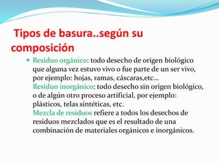 La basura se define como todo material y producto no deseado que carece de valor económico y debe eliminarse. Existen diferentes tipos de basura según su composición, como residuos orgánicos, inorgánicos, peligrosos y mezcla de residuos. La basura también varía según su origen, pudiendo provenir de hogares, industrias, hospitales, comercios o espacios urbanos y espaciales. Un relleno sanitario es el lugar donde los residuos separados se entierran de forma controlada para captar gases, mientras