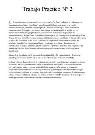El documento describe la evolución de las relaciones entre ciencia, tecnología y sociedad en América Latina desde la década de 1950. Inicialmente, los países de la región se embarcaron en la formulación de políticas científicas y tecnológicas, lo que llevó a una fuerte institucionalización de la investigación y el desarrollo. Sin embargo, los esfuerzos estatales no lograron generar una dinámica sostenida de innovación. Más tarde, durante la década de 1980, el rol del Estado dismin