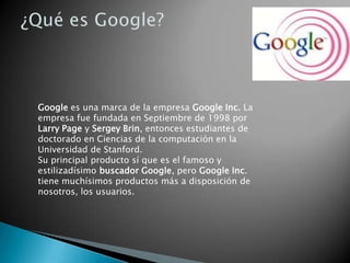 ¿Qué es Google?Google es una marca de la empresa Google Inc. La empresa fue fundada en Septiembre de 1998 por Larry Page y Sergey Brin, entonces estudiantes de doctorado en Ciencias de la computación en la Universidad de Stanford.Su principal producto sí que es el famoso y estilizadísimo buscador Google, pero Google Inc. tiene muchísimos productos más a disposición de nosotros, los usuarios.