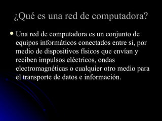 Este documento resume los conceptos básicos de las redes de computadoras. Define una red como un conjunto de equipos conectados que comparten datos e información. Explica que las redes se clasifican en LAN, MAN y WAN y describe brevemente cada una. Detalla los elementos hardware y software necesarios para conectar dos computadoras y las ventajas de las redes, como compartir archivos y recursos.
