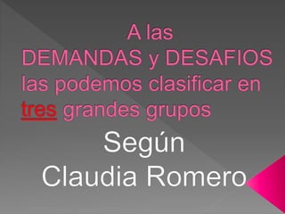 El documento discute tres cambios principales que las escuelas deben adoptar para adaptarse a los cambios en la sociedad: 1) enfocarse en la diversidad de ritmos de aprendizaje y tipos de inteligencia de los estudiantes en lugar del currículum tradicional, 2) cambiar el modelo pedagógico de centrarse en los contenidos a enfocarse en el estudiante activo guiado por el maestro, y 3) reestructurar la organización escolar para dar más autonomía y apoyo a los maestros.