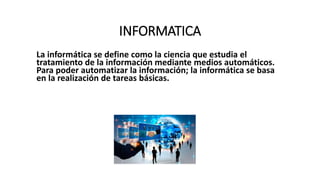 Este documento resume conceptos clave de informática como software, hardware, computadora, placa madre, periféricos de entrada y salida. Explica que la informática estudia el tratamiento automático de la información mediante medios digitales, y que una computadora procesa datos a través de un programa (software) y su estructura física (hardware). También define elementos como la placa madre, que conecta los componentes, y los periféricos, dispositivos externos que se conectan pero no forman parte del núcleo de la computadora.