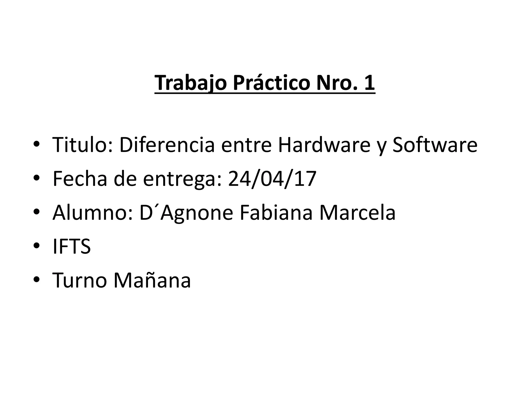 Este documento describe la diferencia entre hardware y software. Define hardware como los componentes físicos de un sistema informático como la placa base, periféricos internos y fuente de alimentación. Define software como las instrucciones electrónicas que indican al ordenador qué hacer, como los programas usados para dirigir las funciones de un sistema de computación. Finalmente, resume que la diferencia clave es que el hardware es la parte física mientras que el software es el aspecto lógico, y el software se puede cambiar o modificar con más frecuencia que el hardware.