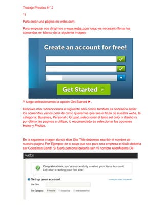 El documento proporciona instrucciones para crear una página web en dos servicios diferentes: webs.com y webnode.com. Para crear una página en webs.com, el usuario debe completar formularios con la información del sitio como el título, categoría y tema, y luego crear el sitio. Para crear una página en webnode.com, el usuario debe registrarse, seleccionar un tipo de sitio, agregar un título, eslogan e idioma, elegir una plantilla y luego crear la primera página. Ambos procesos guían