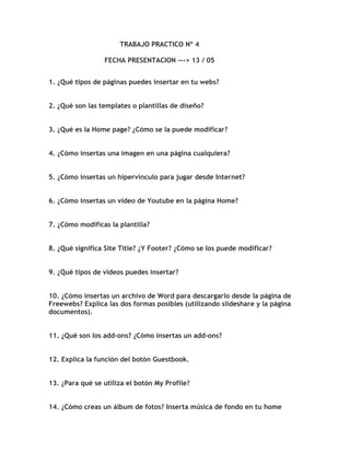 Este documento proporciona instrucciones sobre cómo personalizar y modificar una página web utilizando Freewebs. Explica cómo insertar diferentes elementos como imágenes, videos, hipervínculos y documentos de Word, así como cómo modificar la plantilla, el título del sitio, el pie de página y crear álbumes de fotos. También cubre cómo agregar add-ons, la función del libro de visitas y el perfil del usuario.