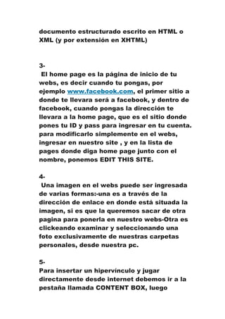 Este documento proporciona instrucciones sobre cómo personalizar una página web. Explica cómo agregar diferentes tipos de páginas como calendarios, foros y fotos. También describe cómo modificar el diseño y formato de una página a través de plantillas y hojas de estilo en cascada. Además, brinda detalles sobre cómo insertar videos, enlaces, presentaciones y gestionar páginas dentro de un sitio web.