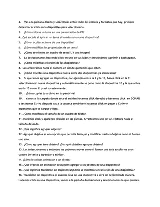 Este documento contiene una serie de preguntas sobre las funciones y herramientas del programa PowerPoint. Algunas de las preguntas se refieren a cómo agregar diferentes elementos como texto, imágenes y gráficos a las diapositivas, cómo modificar el diseño y orden de las diapositivas, y cómo aplicar efectos de animación y transición entre diapositivas. También incluye preguntas sobre cómo guardar y compartir presentaciones de PowerPoint.