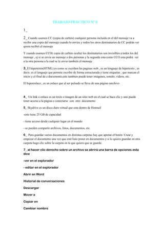 Este documento describe diferentes funciones de correo electrónico, almacenamiento en la nube y aplicaciones web de Microsoft. Explica la diferencia entre copia carbono (CC) y copia carbono oculta (CCO), y cómo funcionan los hipervínculos en páginas web. También describe cómo crear carpetas y guardar documentos en SkyDrive, descargar archivos desde SkyDrive a otra computadora, y usar las aplicaciones web de Office para ver y editar documentos almacenados en la nube.
