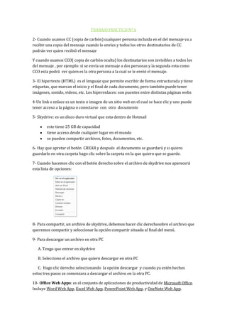 El documento describe cómo funcionan las copias de carbono (CC y CCO) en los correos electrónicos, explica qué es el hipertexto (HTML) y los hiperenlaces, y proporciona instrucciones sobre cómo usar SkyDrive de Microsoft para almacenar archivos en la nube, compartir archivos, descargar archivos en otra PC, y eliminar o cambiar el nombre de archivos. También explica cómo usar las aplicaciones web de Office para ver y editar documentos almacenados en SkyDrive desde cualquier navegador web.