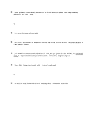 Este documento proporciona instrucciones sobre cómo realizar diferentes acciones en una hoja de cálculo de Excel, como seleccionar celdas y rangos de celdas, modificar el formato y alineación del texto en celdas, sumar celdas, e insertar gráficos. Explica cómo seleccionar celdas individuales o múltiples celdas de manera continua o no continua, así como cómo modificar el tamaño de las columnas y filas arrastrando los bordes. También describe cómo cambiar el formato numérico de c