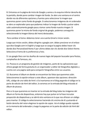 Este documento proporciona información sobre el navegador web Google Chrome y sus funciones. Explica cómo usar la barra de direcciones, abrir pestañas y marcadores. También describe cómo personalizar las preferencias de Chrome y cambiar el tema y la imagen de fondo de la página de inicio de Google. Por último, brinda detalles sobre programas como Google Docs, Picasa y Google Play.