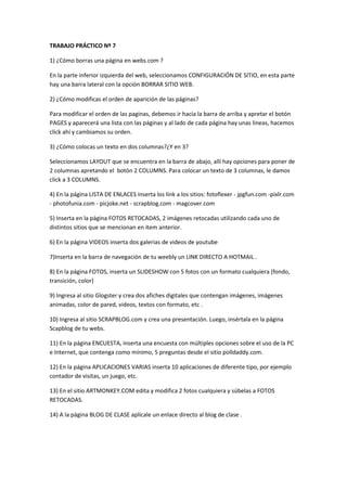 El documento proporciona instrucciones para completar 14 tareas en un sitio web de webs.com, incluyendo cómo borrar páginas, modificar el orden de páginas, agregar formatos de columnas, insertar enlaces y contenido multimedia como imágenes, videos, encuestas y aplicaciones en diferentes páginas, y editar imágenes en sitios externos.