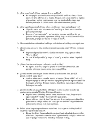 El documento proporciona instrucciones para varias tareas relacionadas con la creación y edición de blogs en Blogger, incluyendo cómo crear un nuevo blog, agregar imágenes y videos, insertar gadgets externos, y cargar archivos desde servicios como Skydrive y Slideshare.
