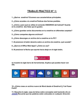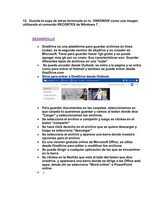 Este documento proporciona instrucciones sobre cómo usar OneDrive de Microsoft. OneDrive es un servicio de almacenamiento en la nube que permite guardar archivos en línea de forma gratuita. El documento explica cómo acceder a OneDrive, guardar y compartir archivos en diferentes carpetas, descargar archivos al PC, y crear nuevos documentos de Word y PowerPoint utilizando las aplicaciones web de Office.