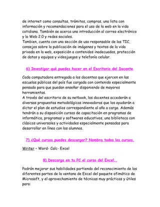 El sitio conectarigualdad.gob.ar busca reducir las brechas digitales, educativas y sociales en Argentina mediante el uso de netbooks tanto en escuelas como en hogares. Ofrece aplicaciones educativas como Cheese para fotografía, recursos para docentes como propuestas metodológicas e innovadoras, y cursos de capacitación y programas educativos como Writer, Word, Calc y Excel. También incluye secuencias didácticas y fascículos digitales que pueden descargarse.