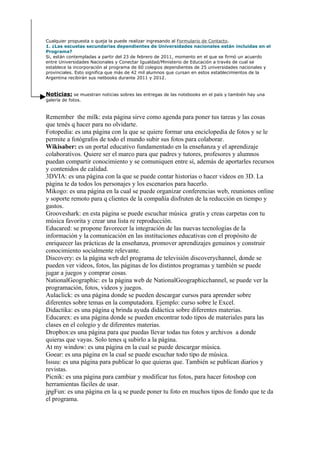 Este documento presenta el programa Conectar Igualdad en Argentina, el cual busca reducir las brechas digitales, educativas y sociales a través de la distribución de 3 millones de netbooks a estudiantes y docentes de escuelas secundarias públicas entre 2010-2012. Además, provee recursos educativos digitales y capacitación docente para aprovechar las nuevas tecnologías en el aula. El programa es financiado por el estado a trav