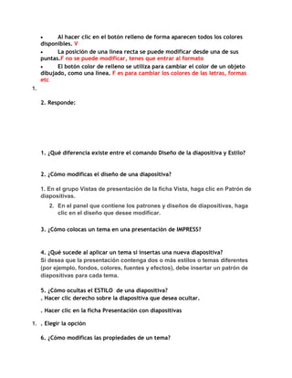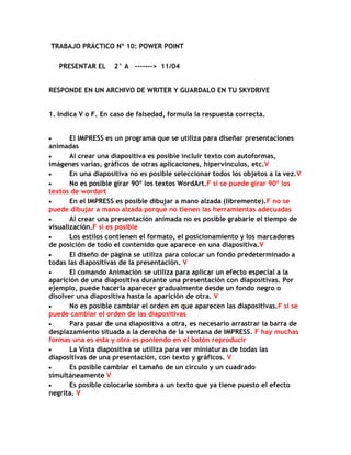 El documento proporciona instrucciones para un trabajo práctico en PowerPoint que incluye preguntas sobre funciones y comandos de PowerPoint. Se solicita que las respuestas se guarden en un archivo de Word y se suban a OneDrive. Se incluyen 19 preguntas sobre temas como cómo insertar diapositivas, aplicar estilos y temas, modificar el tamaño y orden de diapositivas, y agregar animaciones y transiciones.