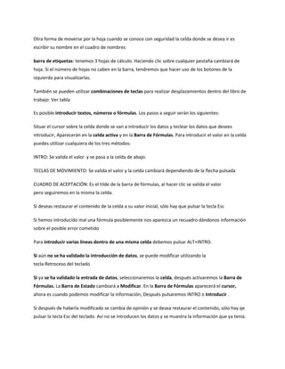 El documento proporciona instrucciones sobre las características y funcionalidades básicas de Microsoft Excel. Explica cómo iniciar Excel y navegar por la interfaz, incluidas las pestañas de la cinta de opciones, la barra de fórmulas, las barras de desplazamiento y la barra de estado. También describe cómo seleccionar y manipular celdas mediante copiar, cortar, pegar y mover, y cómo guardar, cerrar e iniciar nuevos libros de trabajo en Excel.