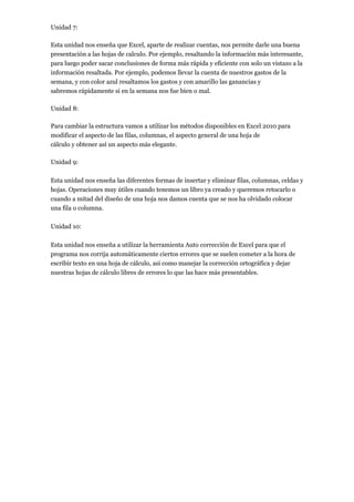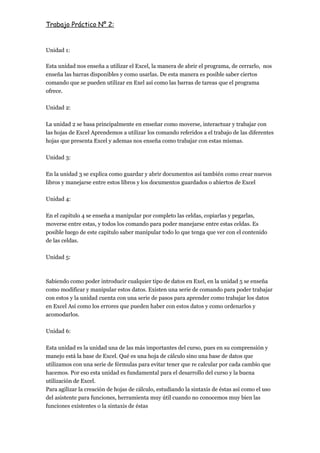 Este documento presenta un resumen de 10 unidades de un trabajo práctico sobre Excel. Las unidades cubren temas como usar las barras de tareas y hojas de Excel, manipular celdas, introducir y modificar datos, usar fórmulas, dar formato, insertar y eliminar filas y columnas, y corrección automática.
