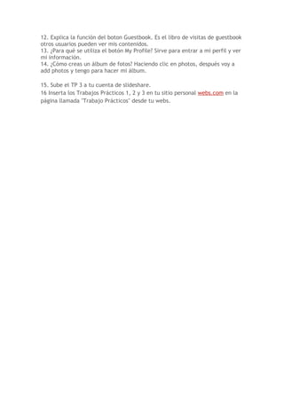 El documento presenta 15 tareas relacionadas con el desarrollo de sitios web y presentaciones que deben completarse para el 28/4. Entre ellas se encuentran insertar diferentes tipos de contenidos como videos, imágenes y archivos; aplicar plantillas de diseño; modificar la página de inicio y el pie de página; insertar hipervínculos; crear álbumes de fotos; y subir trabajos prácticos realizados a plataformas como SlideShare y un sitio web personal.