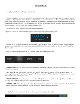 Webs.com es una página para crear sitios web de forma gratuita. El documento explica que el autor usó Webs.com para subir trabajos escolares creando páginas y utilizando las diversas herramientas de edición como agregar texto, imágenes y vídeos. También describe las funciones de los botones para administrar páginas, editar sitios, cambiar plantillas y acceder al panel de control entre otras opciones.