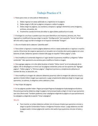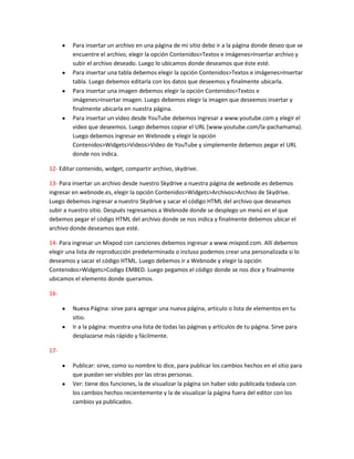 Este documento proporciona instrucciones sobre cómo crear y administrar un sitio web en Webnode. Incluye pasos como registrarse, agregar páginas y contenido, modificar la cabecera y el eslogan, y publicar el sitio. También explica cómo agregar enlaces, archivos, tablas, imágenes y videos insertando el código correspondiente.