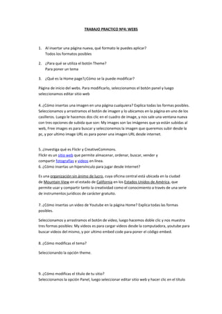 Este documento contiene 19 preguntas sobre cómo crear y modificar una página web en Freewebs. Explica cómo insertar imágenes, videos, hipervínculos y aplicaciones. También cubre cómo cambiar el tema, título, nombre de páginas y agregar una imagen de fondo y cabecera. Por último, detalla cómo modificar el formato de letra del título y agregar un marco a las imágenes.