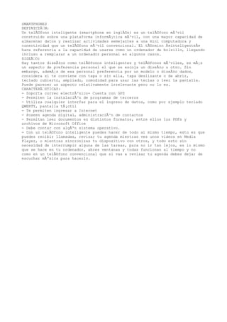 Un smartphone es un teléfono móvil con mayores capacidades de almacenamiento de datos, funcionalidades similares a una computadora miniatura y conectividad, que le permiten usarse como un ordenador de bolsillo. Los smartphones tienen diversos diseños y características como pantallas táctiles, cámaras, correo electrónico, GPS, tiendas de aplicaciones, reproductores multimedia, navegadores web y sistemas operativos que permiten realizar múltiples tareas al mismo tiempo.