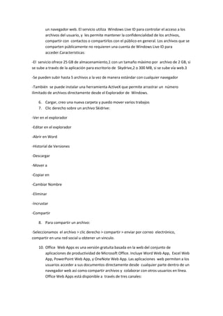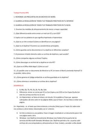 Este documento presenta una serie de preguntas sobre el uso de Microsoft Word, SkyDrive y Office Web Apps. Se solicita responder las preguntas en un archivo de Word y guardar las respuestas en el SkyDrive y blog personal. Las preguntas cubren temas como almacenamiento, correo electrónico, hipertexto, enlaces, características de SkyDrive, compartir archivos y usar Office Web Apps.