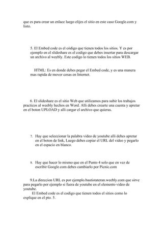 Este documento proporciona instrucciones para insertar diferentes elementos multimedia como videos, imágenes y presentaciones en una página web creada en Weebly. Explica cómo insertar videos de YouTube copiando el código URL, agregar imágenes seleccionándolas de un archivo, y añadir presentaciones subiéndolas a SlideShare y pegando el código HTML resultante. También brinda detalles sobre cómo crear enlaces a otros sitios web y cómo utilizar códigos de incorporación para incluir contenido externo.