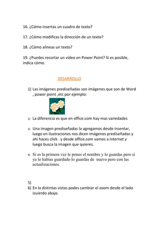 Este documento contiene preguntas sobre funciones básicas de PowerPoint como insertar y modificar imágenes, diapositivas y objetos. Explica cómo agregar diferentes tipos de imágenes y objetos, aplicar formato a texto y objetos, copiar/mover/eliminar diapositivas u objetos, y utilizar diferentes vistas como la vista presentación.
